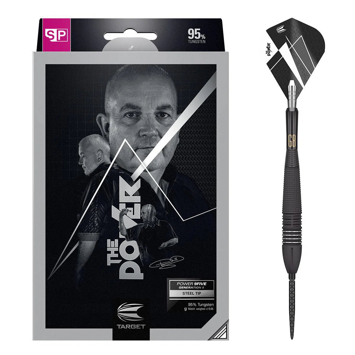 Target Darts Phil Taylor Power 9Five Gen 8 95% Tungsten Steel Tip Darts: 3 Darts, 3 Dart Flights and 3 Dart Shafts.