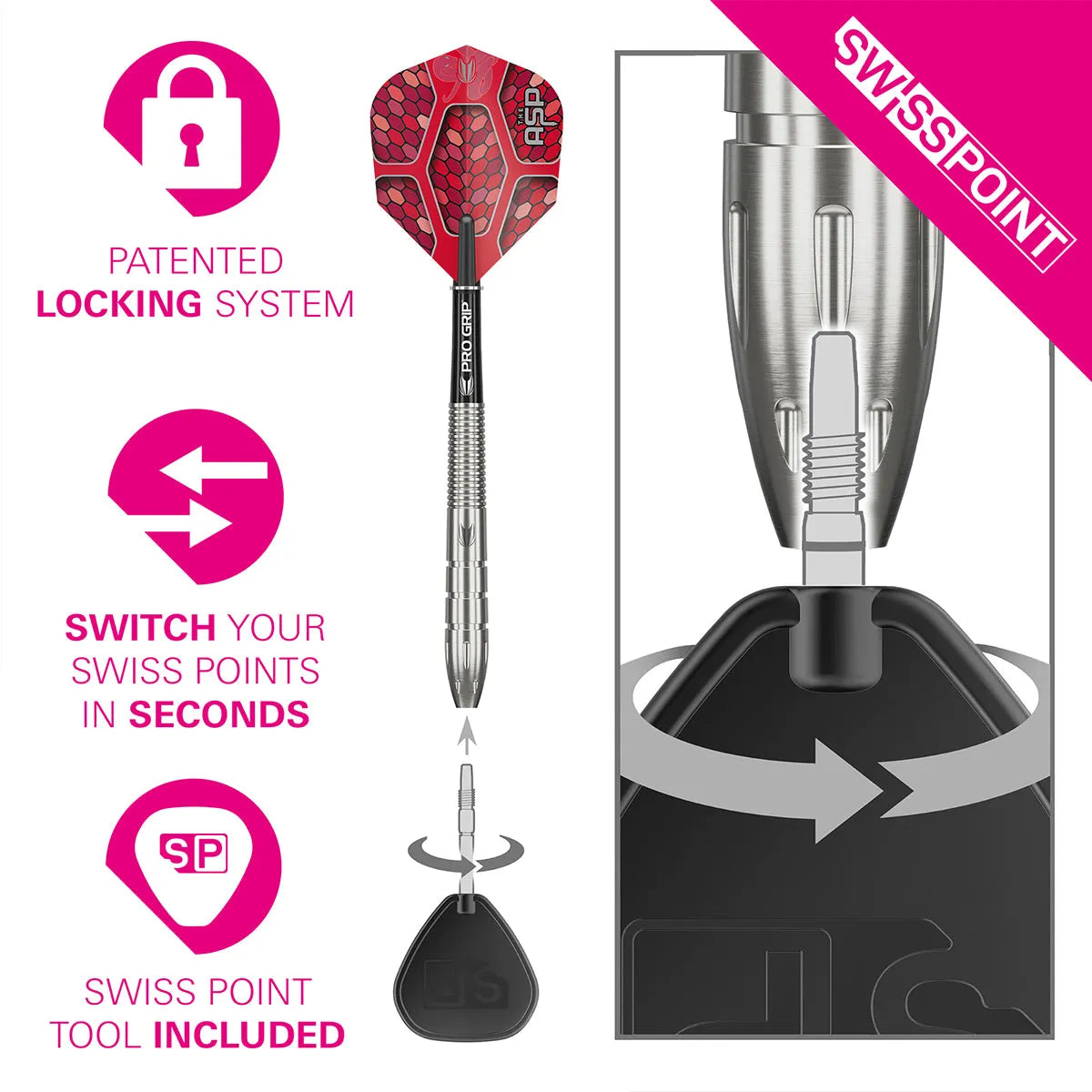 Equipped with 26mm Silver Swiss Points, these darts utilize a patented locking system for quick and easy point replacement using the included Swiss point tool. The advanced taper and thread technology ensure a secure fit, enhancing stability and precision during play.