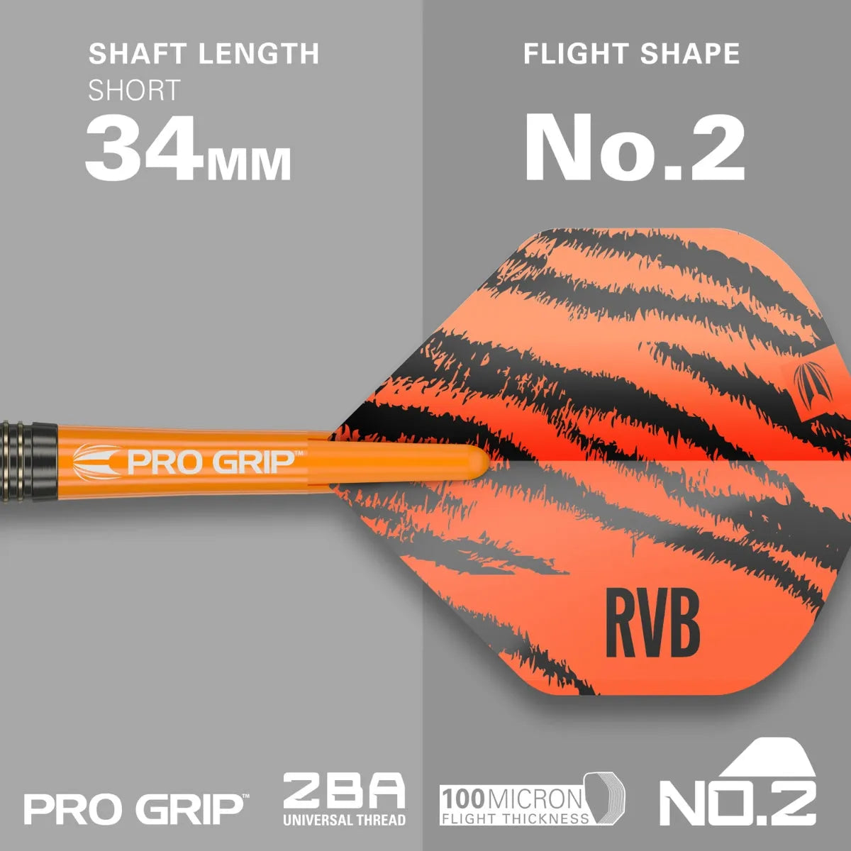 "The RVB Starter set features intricate radial grooves on the barrel for enhanced grip. The barrel is coated with a PVD coating and complemented with red & gold rings to give a vibrant finish. The dart range includes a range of additional accessories to ensure you have the optimum set up to play. The kit is completed with 3 sets of Pro Grip shafts, 3 sets of ‘RVB flights and 1 storage wallet. "