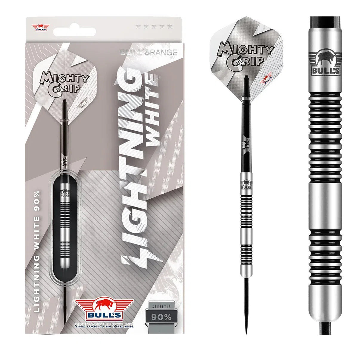 The Bull's Lightning White 90% Darts are available in three different weights to cater to varying player preferences: