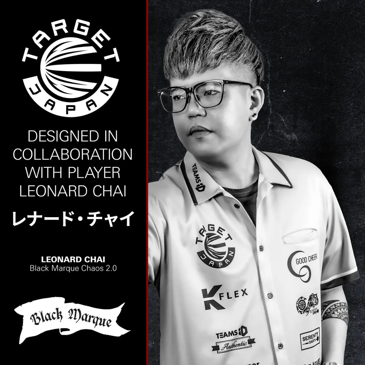 The Black Marque Chaos 2.0, a high-performance steel tip dart set designed in collaboration with Leonard Chai, the 2022 CC1K Qualifying Stage Champion. The 90% tungsten barrel features a front-loaded design that combines control and thrust for a powerful throw. Fine grid-like cuts along the barrel deliver a distinctive grip and tactile feel, while the cylindrical rear ensures accessibility. The wider front diameter boosts stability, and a bold X-pattern at the front adds a striking visual element.