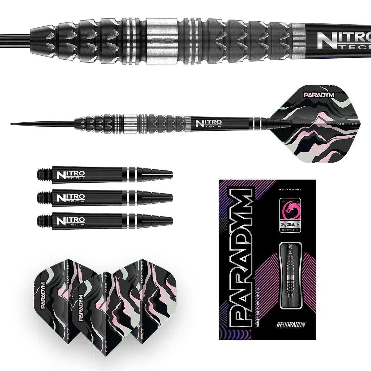 Red Dragon Paradym 90% Tungsten Steel Tip Darts Contains: 3 Darts, 3 Dart Flights and 3 Dart Shafts.
