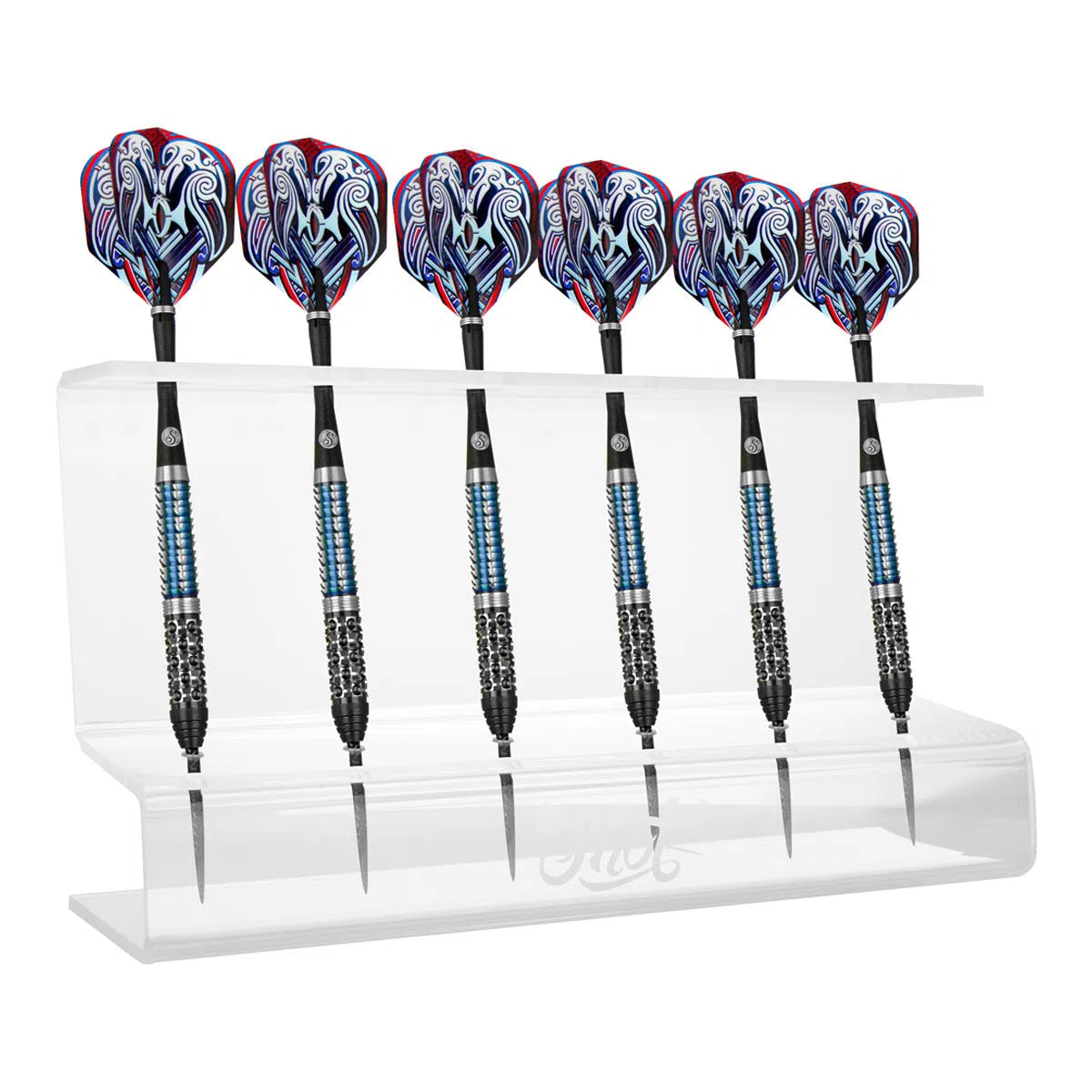Keep your darts organized and ready for play with this two-set dart display stand. It stores and displays six fully assembled darts. The stand is made from strong acrylic and laser etched with the Shot Darts logo.