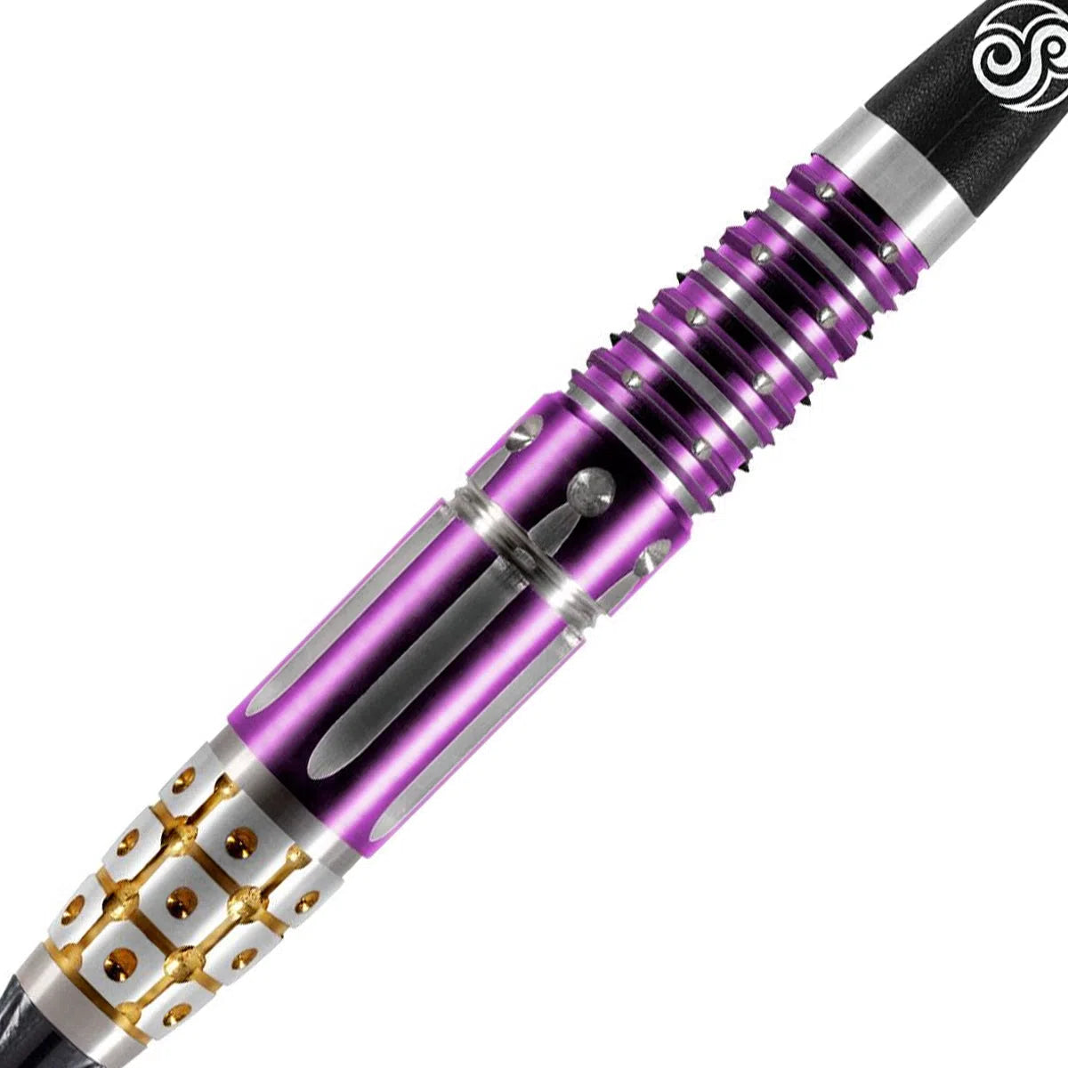 Barrel Design: The Caesar dart set features three new distinct grip profiles which allow a multi-level finger reference points along the dart. The barrel nose features the defensive Testudo grip, named for the ‘tortoise’ shield-wall formation, used by legionaries to protect themselves against enemy archers. Followed by the Glaidus (sword) grip, a strong yet superfine stacked pattern grip with deep axial cuts provides powerful positioning and control. The dart finishes with the Hilt grip, a multi-directional shark grip re-machined to add additional traction, locking the fingers into a no-slip area. Finished in a rich and majestic purple and gold Titanium coating for strength and beauty, 100% designed, manufactured and colour plated at our factory in New Zealand.