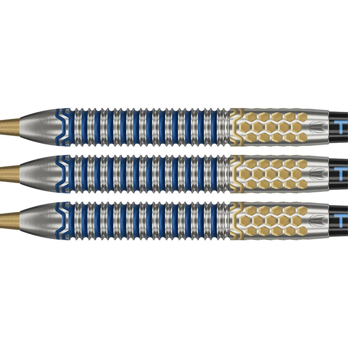 Josh Rock joins Team Target in 2025, as the 2024 PDC Dutch Darts Championship winner and 2022 PDC World Youth Champion. Introducing his Generation 1 darts, designed to his exact match play requirements -“Rocky” plays with the 24G dart weight. The 90% tungsten barrel is straight with a tapered nose, featuring unique precision milling with a dynamic celled grip design, offering enhanced control and a consistent release. The intricate geometric cell pattern, paired with a striking blue and gold aesthetic.