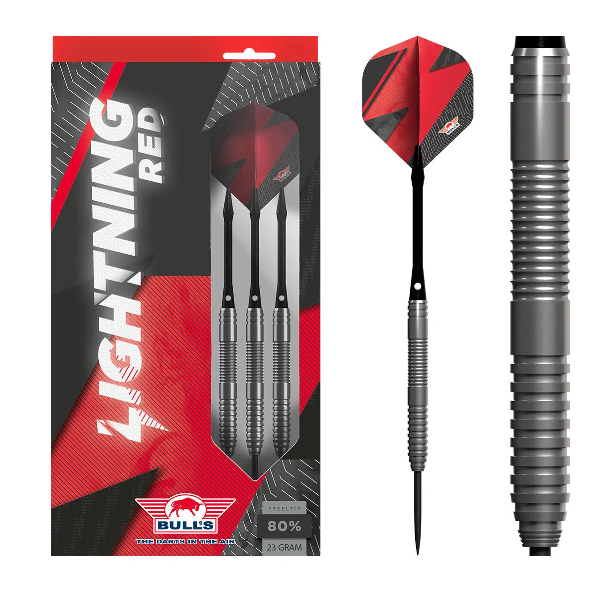 - Available Weights: Choose the perfect weight to suit your throwing style. These new Bull’s Lightning 80% Red darts are available in 21, 23 and 25 grams steeltip.