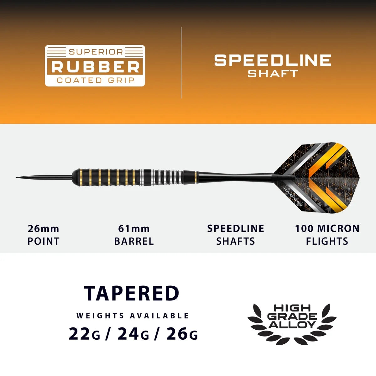 These parallel barrel darts showcase a striking two-tone black and gold finish. The vulcanised rubber grip delivers a comfortable, non-slip hold, helping players stay steady and focused when aiming for those all-important doubles.