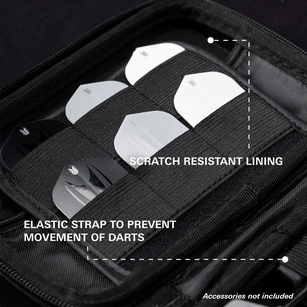 Constructed with a durable hard shell, the XL Takoma keeps your darts safe and protected. The scratch-resistant interior lining secures 6 fully assembled darts, with expanded space for spare flights, shafts, Swiss Points, and your Swiss Point tool a bold, practical choice for players and fans alike.