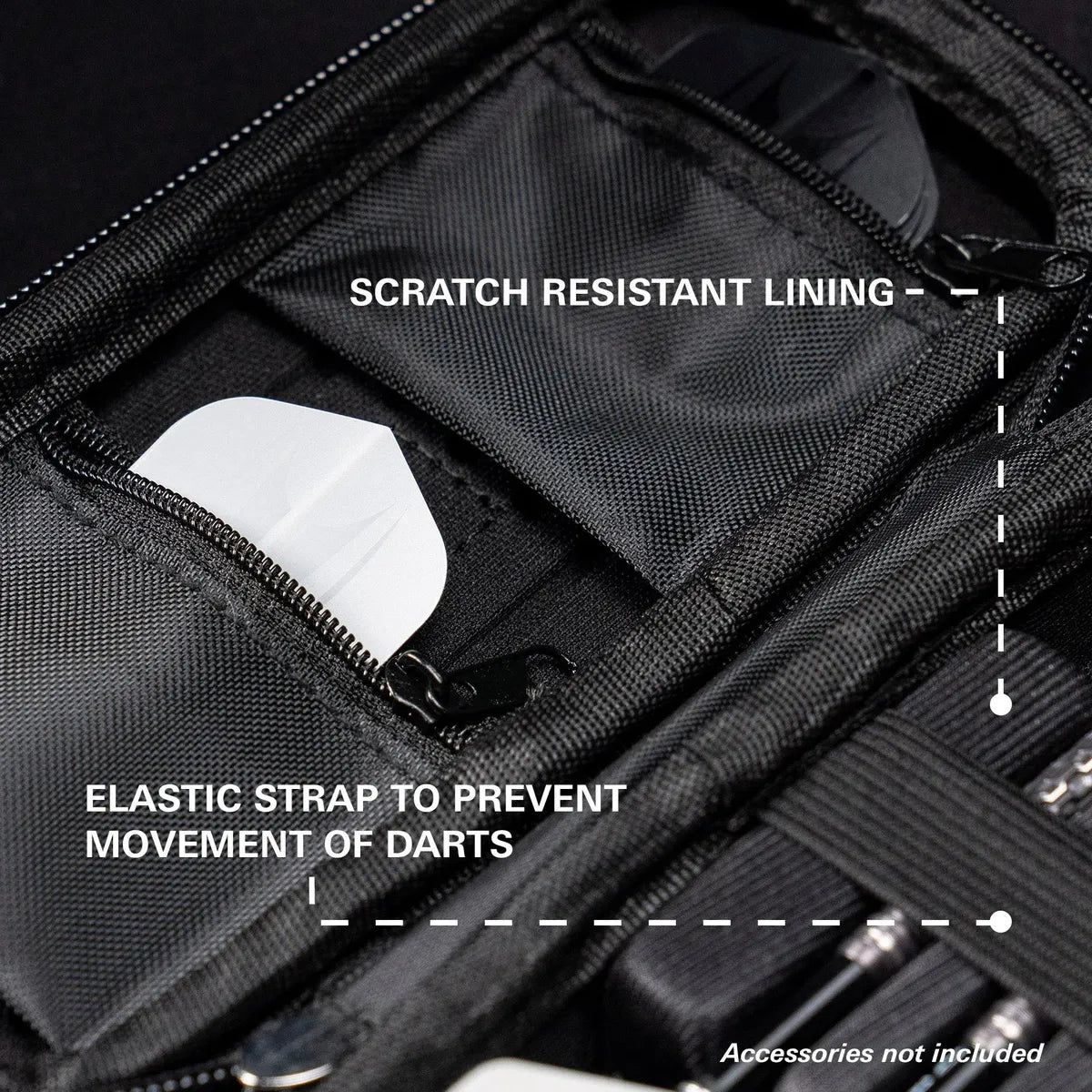 Constructed with a durable hard shell, the Takoma keeps your darts safe and protected. The scratch-resistant interior lining secures 3 fully assembled darts, while zip pockets provide space for additional accessories such as spare flights, shafts, Swiss Points, or your Swiss Point tool combining style and practicality in one premium case.