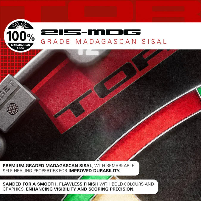 Discover Target Darts’ TOR Dartboard, constructed with 215-MDG premium Madagascan sisal, the board offers exceptional self-healing properties, ensuring it remains in top condition through extensive play. Its sanded surface boasts a smooth, flawless finish with bold colours and graphics that enhance visibility and accuracy.