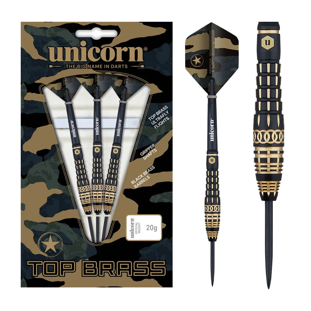 Unicorn Top Brass Steel Tip Darts Contains: 3 Darts, 3 Dart Flights and 3 Dart Shafts.